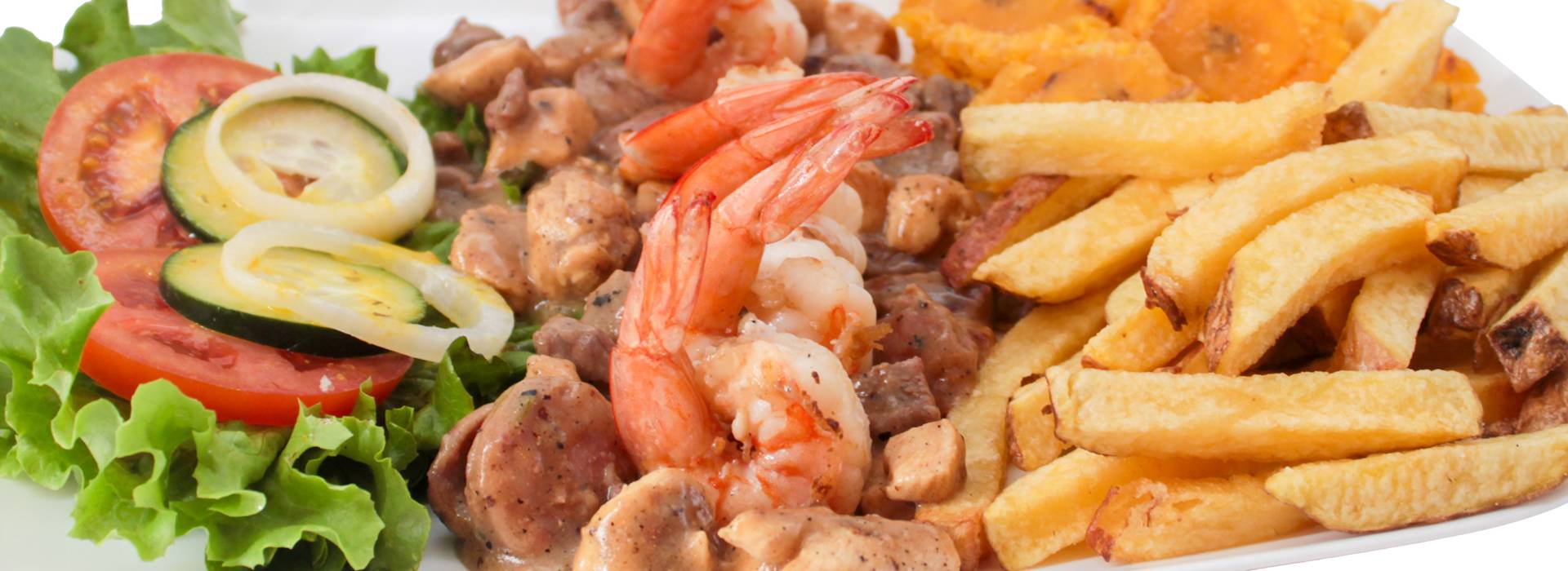 ¼ de libra de carne molida, carne de res picada, pechuga de pollo picada, chorizo paisa, chancho deshebrado BBQ (Pulled Pork), queso cheddar, lechuga, tomate, huevo, pan hecho en casa y porción de papas.
