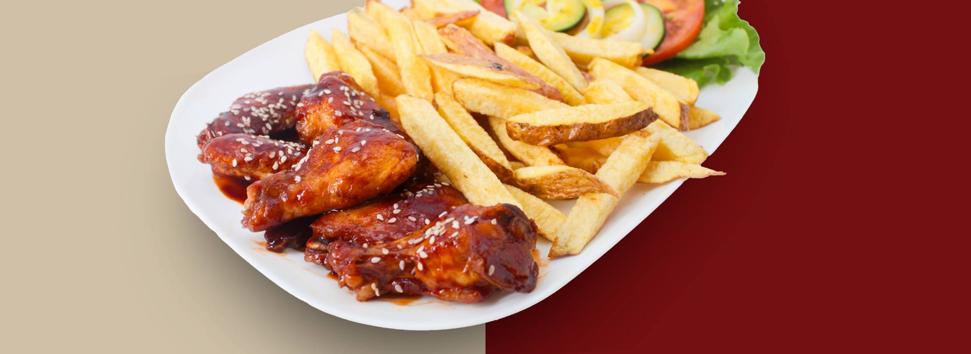 125 gramos de pollo picado en salsa BBQ de la casa, queso cheddar, lechuga, tomate, huevo, pan hecho en casa y porción de papas.